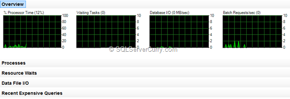 This dashboard also contains expandable/collapsible panes to view detailed information about Processes, Resources, I/O and Expensive Queries. Just click on the expand button to the right of each pane to view the detailed information. Here’s a quick overview of the different graphs and what they show.